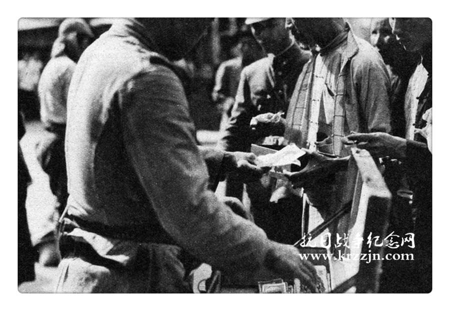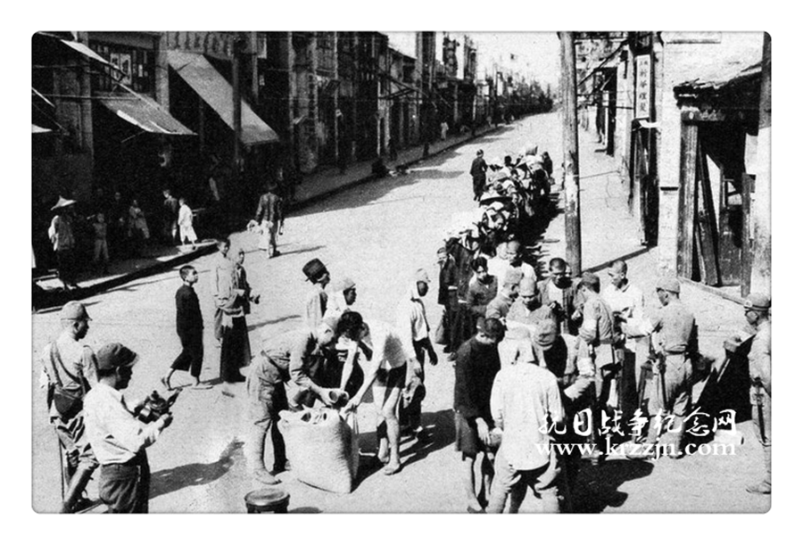 1938年11月,广东,美化宣传日本侵略军,派发纸币给难民买米的日军宪兵队。