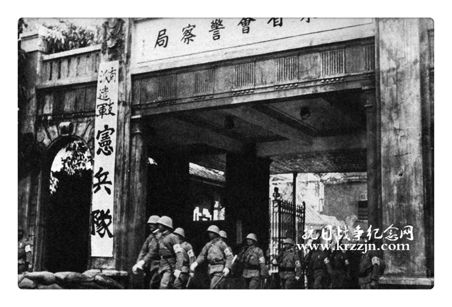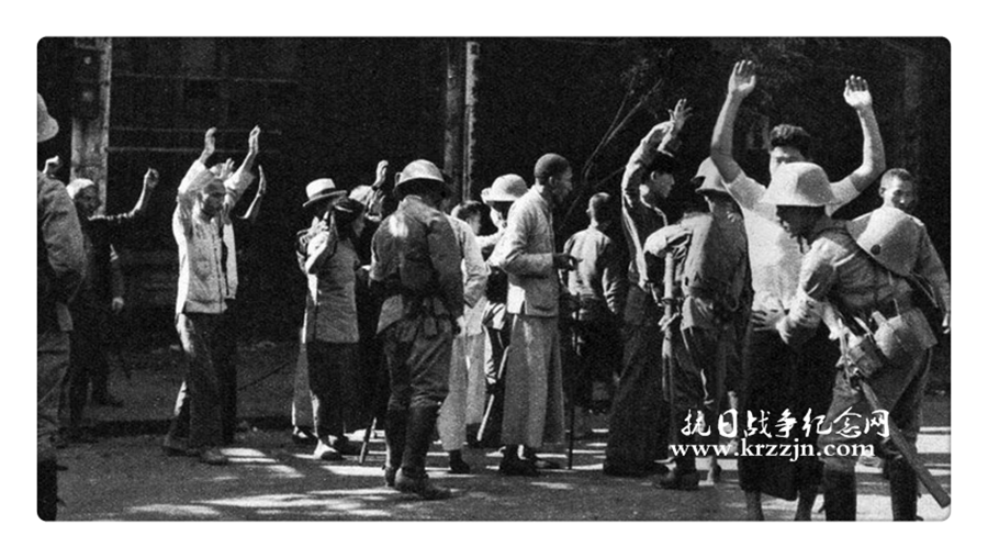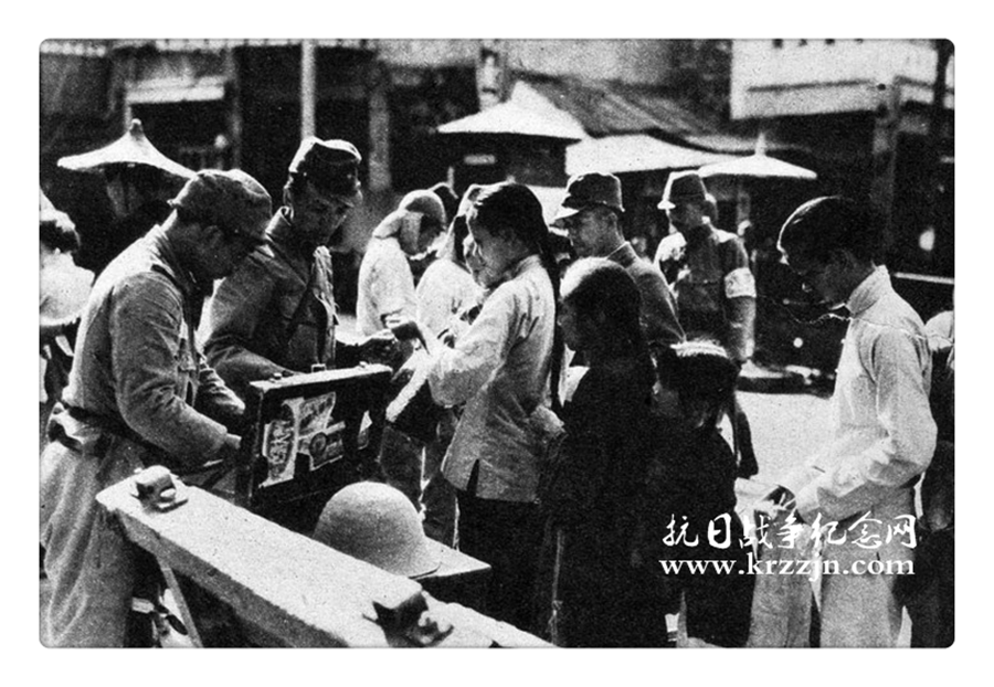 1938年11月,广州市内,对返乡难民进行搜身的日军宪兵队。