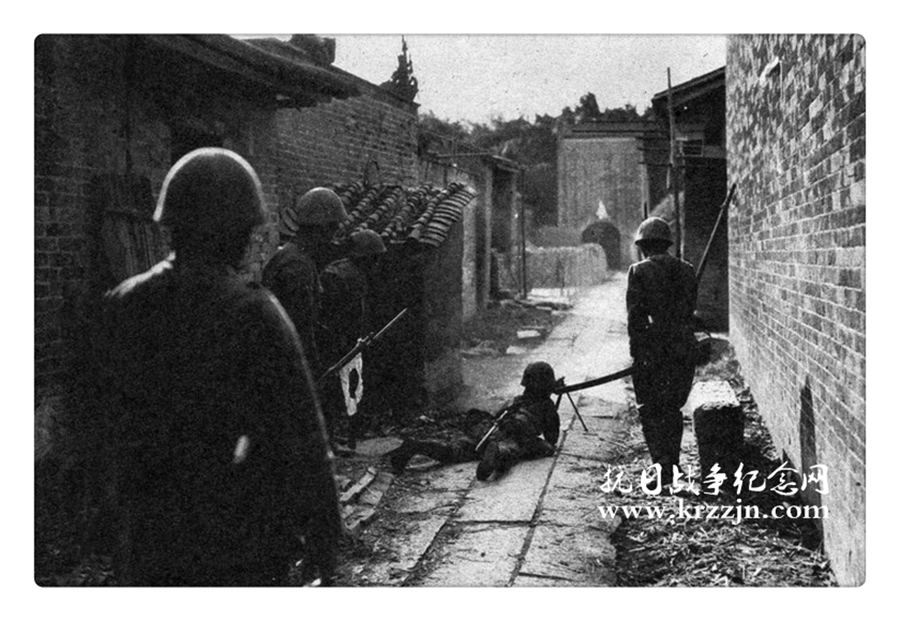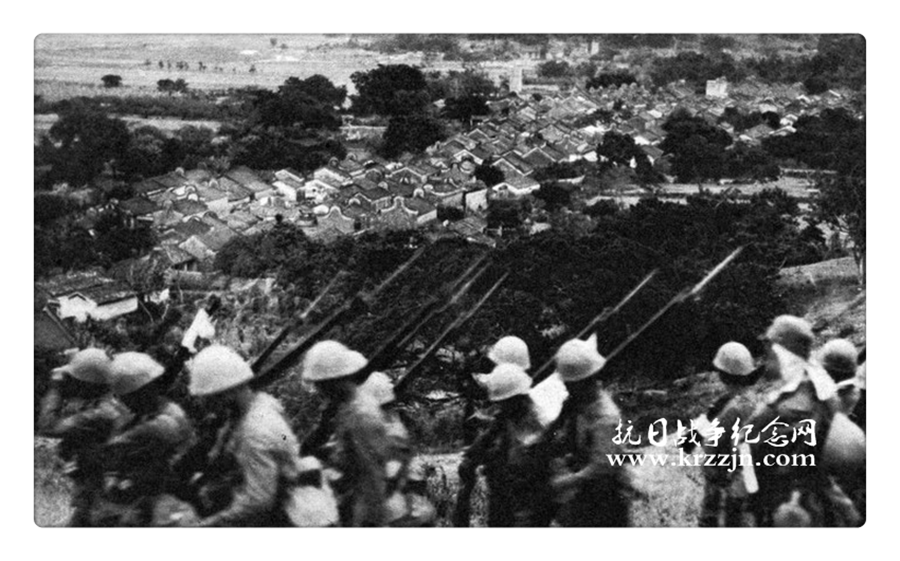 1938年11月,广东东江右岸村落里扫荡的日军部队。