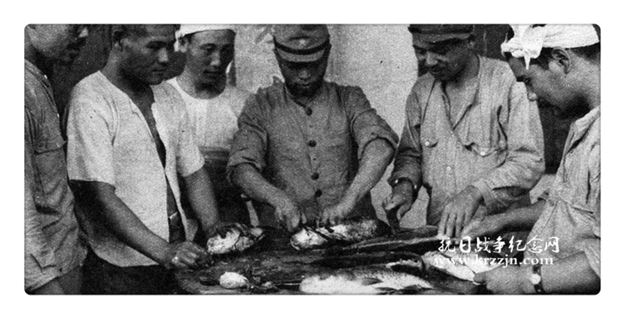 1938年11月,广东佛山,宰鱼的日军士兵。