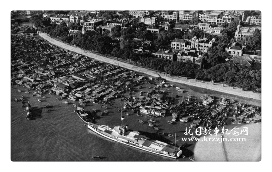 1938年11月,广州沙面租界俯瞰,江面上为英军的炮舰。