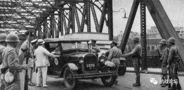 1937年9月6日,外白渡桥上警戒的日军士兵在检查过往车辆。