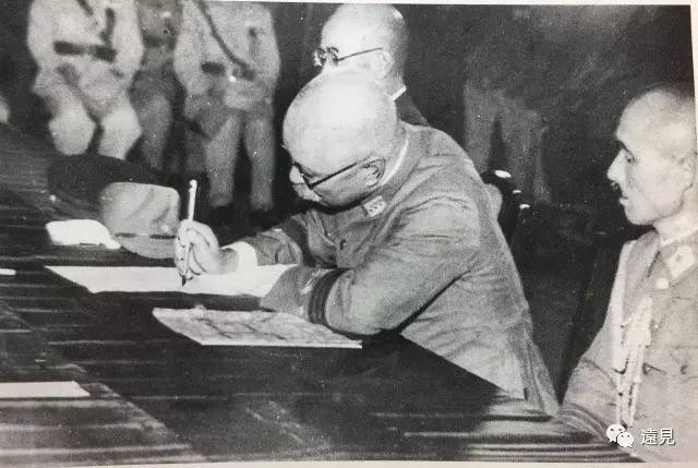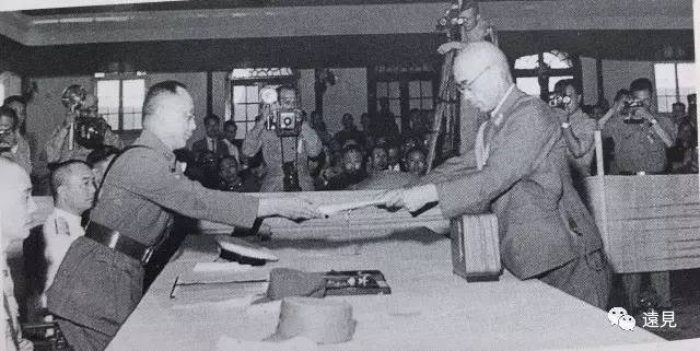 中国陆军总司令何应钦接受日军派遣司令冈村宁次呈递降书 摄影:台『中央社』