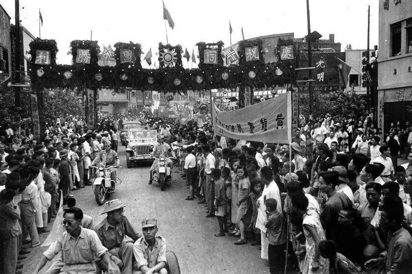 1945年9月3日,重庆。驻华美军参加胜利日大游行,重庆人民列队、舞龙向这些盟友致敬。这天,每一家商店自发悬挂青天白日旗。