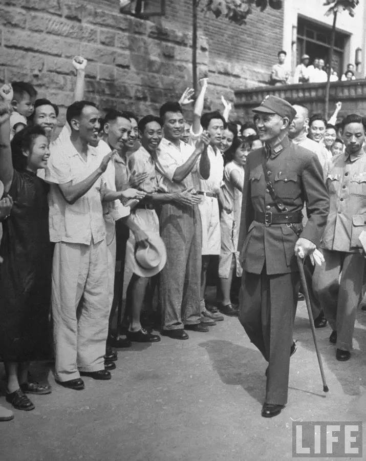 1945年9月3日,重庆。领导中国抗战八年最终取得胜利的中印缅战区总司令蒋介石身着戎装步出官邸,重庆人民发出雷鸣般的欢呼向他致意。
