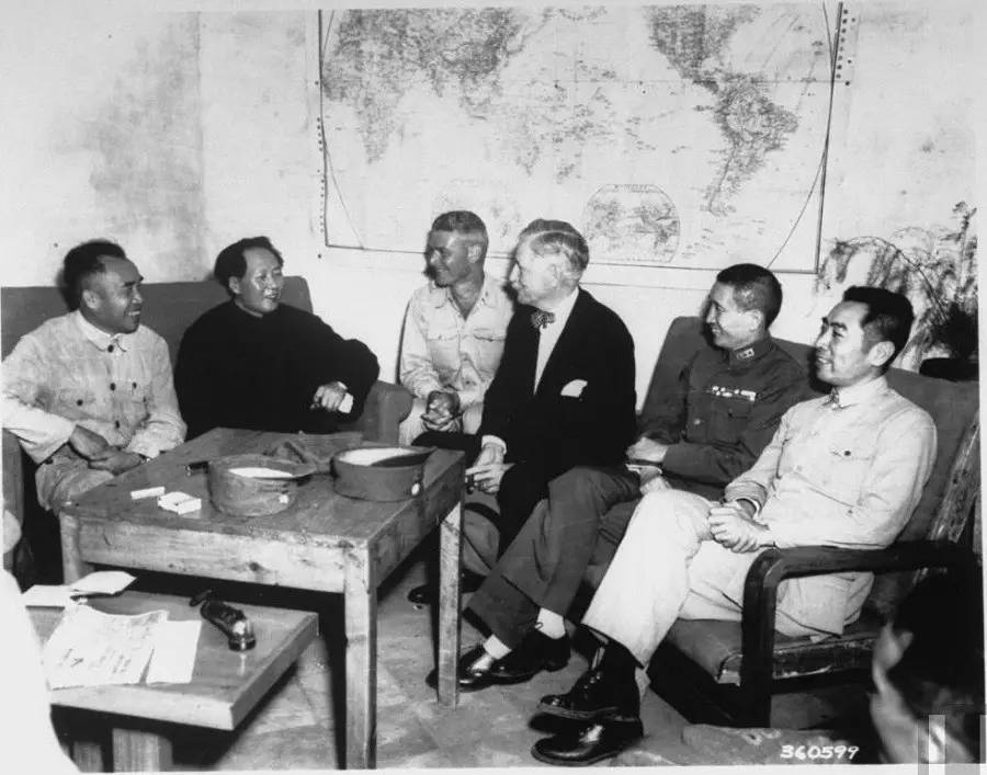 1945年,延安。重庆谈判前,美国驻华大使赫尔利,美国陆军观察员伊顿以及国民党政府代表张治中等,到延安与毛泽东、周恩来、朱德等中共领导人会谈。