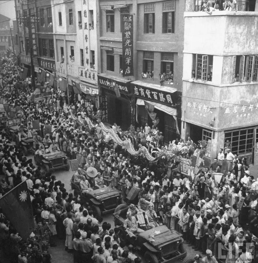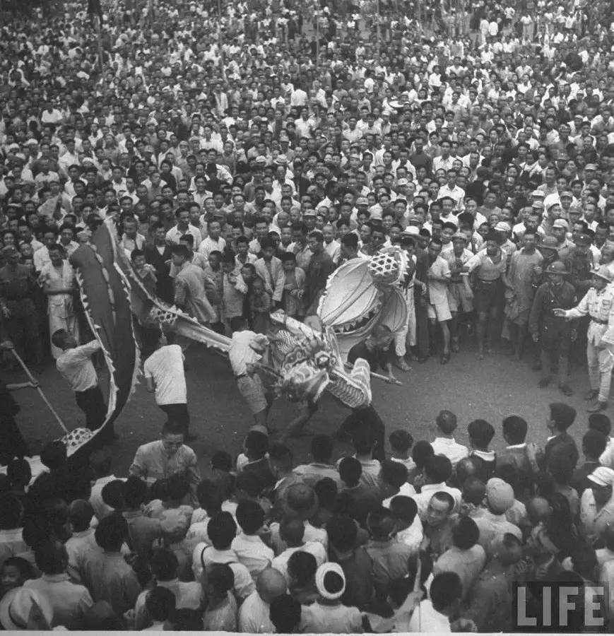 1945年9月3日,重庆,市民舞龙欢庆。当天,重庆成为狂欢的海洋,市民陶醉于欢乐中。街头巷尾,人潮拥挤,抗战期间所受的苦难,终得一洗。