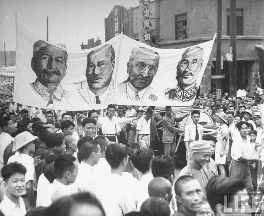 1945年9月3日,重庆。中国人民高举同盟国领袖的头像庆祝胜利日。