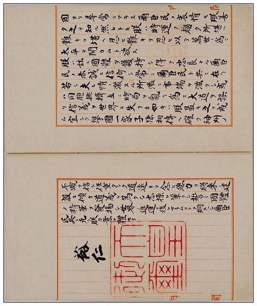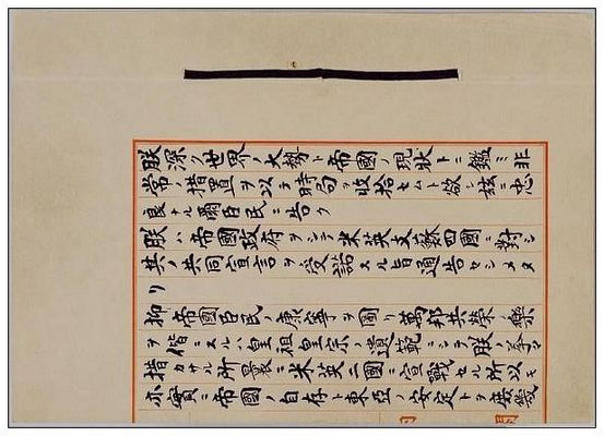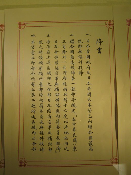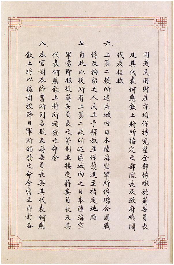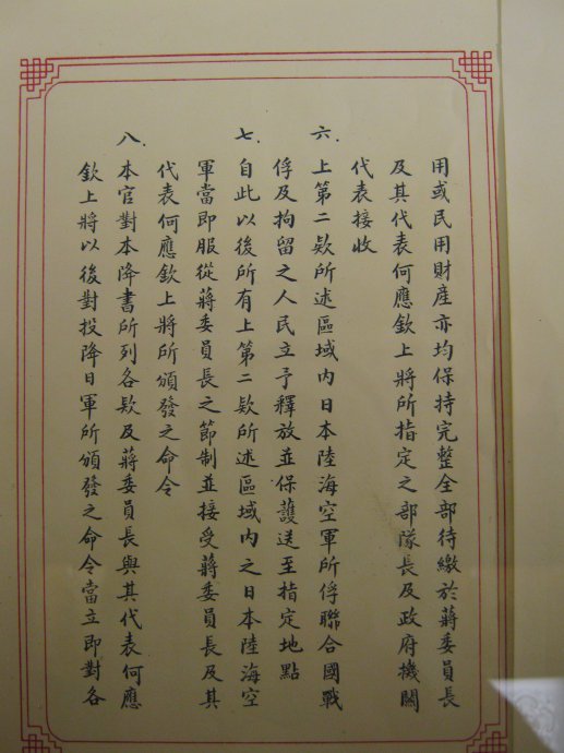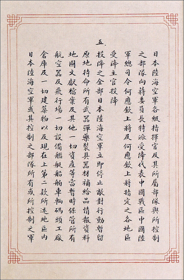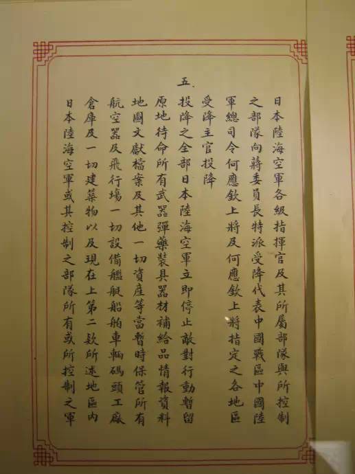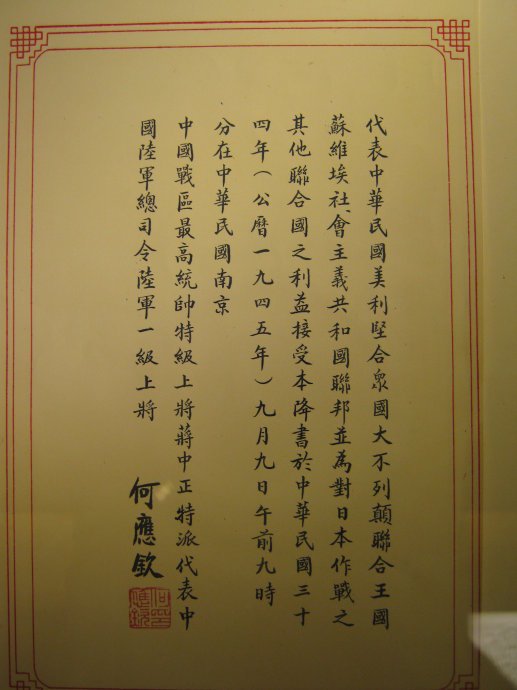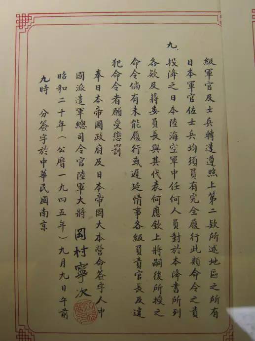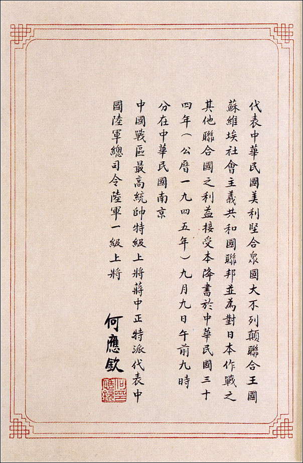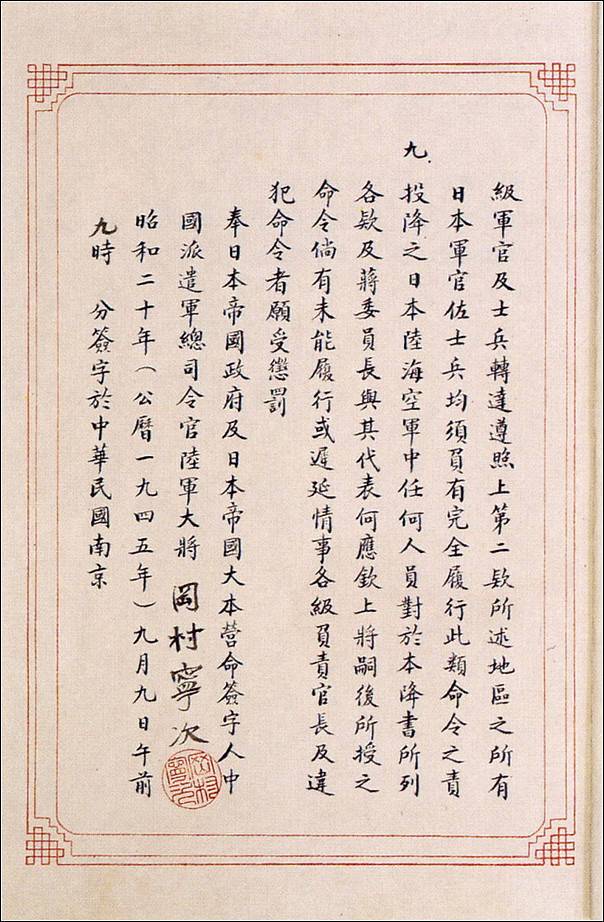 何应钦(左)接受侵华日军总司令冈村宁次的投降书