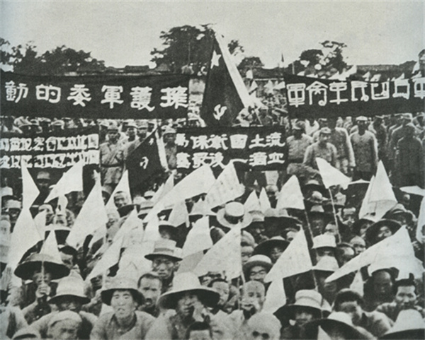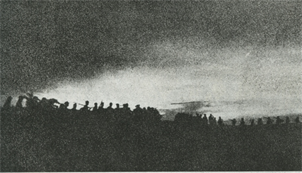 在各个抗日根据地,到处都出现了“母亲叫儿打东洋,妻子送郎上战场”的动人事迹。这是一九四0年抗日战争三周年纪念,晋察冀军区一分区青年抗日先锋队一千余人,举行拥军支前誓师大会。