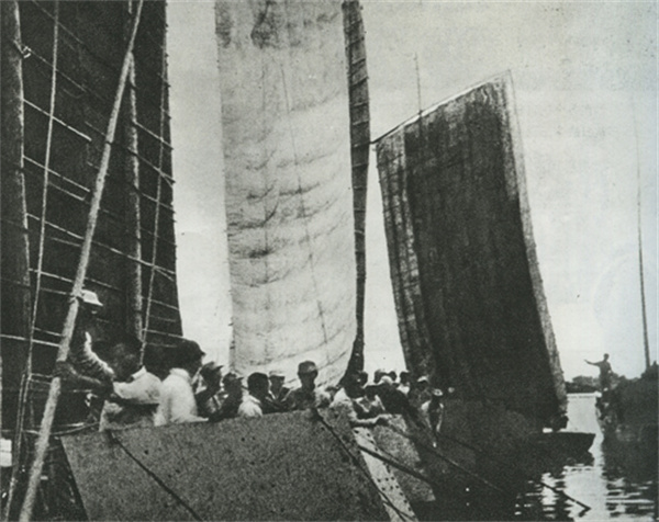 一九四四年夏季攻势中.号称雁翎队的冀中自洋淀水上游击队从冀中文安洼登船向渤海区进发。