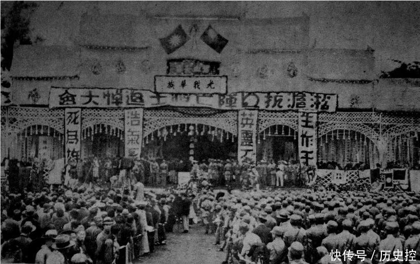 图为追悼淞沪抗日阵亡将士大会。九一八事变后,日本侵略者为了扩大侵略范围,于1932年在上海发动了一·二八事变(日本称之为上海事变或第一次上海事变、淞沪战争)。1932年1月28日夜间,日本侵略军由租界向闸北一带进攻,驻守上海的第19路军奋起抵抗,双方爆发了激烈的战争。这场战争持续了一个多月。由于当时坚持不抵抗政策,淞沪抗日最终以失败告终。第19路军被迫撤离上海。为了追悼在淞沪战争中牺牲的将士,上海各界召开追悼大会,悼念牺牲的将士。