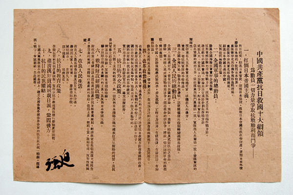 抗日战争爆发后,中国共产党为了给全国人民指明抗战胜利的道路,动员全民族的力量实现全面的抗战,1937年,8月22日至25日中国共产党在洛川会议召开中央政治局扩大会议。在会议上由毛泽东提议并通过了著名的《抗日救国十大纲领》。此件由候文海(上海财经学院)捐赠,一般文物。