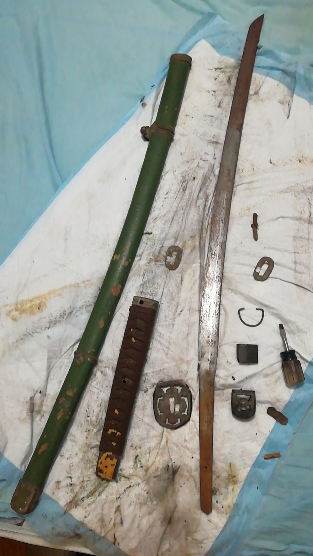 绿漆刀鞘十分罕见,铁皮制,刀条采用花纹钢,落款昭和一年、尉祐定山。