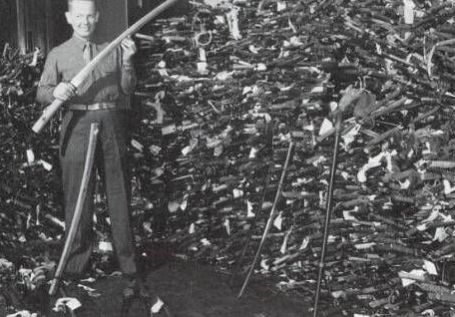 抗战文物,1945年日本投降被没收的,总共约十万把,其中一部分被美国人拿走:叠起来有一人高的刀墙,可见血腥!