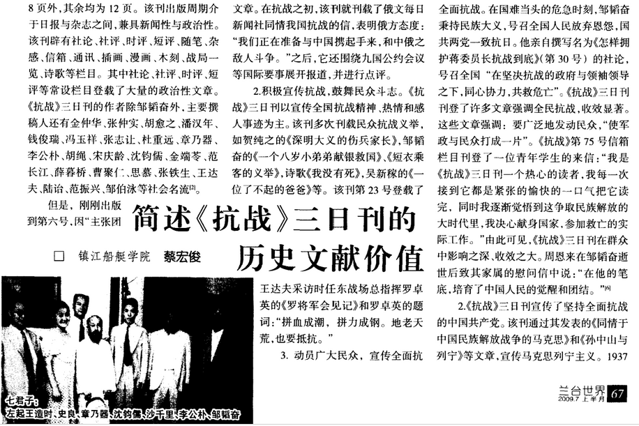 《抗战》三日刊,1937年8月19日在上海创刊,邹韬奋任主编。它是“八一三”淞沪抗战爆发后宣传抗日救亡运动的著名刊物之一,在抗战中具有重要的历史作用。《抗战》三日刊的编辑出版简况 1936年11月22日,国民政府在上海制造了臭名昭著的“七君子之狱”。国民政府通过秘密逮捕,将邹韬奋与沈钧儒、史良、章乃器、李公朴、沙千里、王造时等七位爱国民主人士闪禁起来。