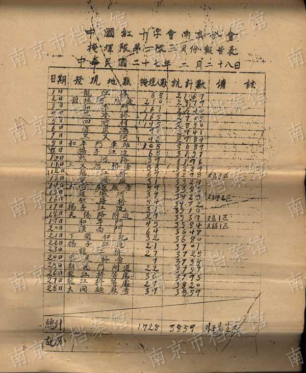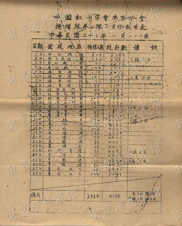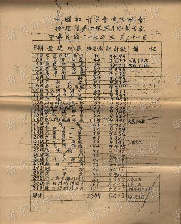 据统计表显示,中国红十字会南京分会第一工作队,于1937年12月24日开始,到1月6日前,联合当地乡人在和平门一带掩埋军民尸体5704具。1938年1月6日后至5月31日,共掩埋尸体6987具。第二工作队,从1937年12月24日到1月6日前,在下关一带掩埋军民尸体3425具。1938年1月6日后至3月31日,共掩埋尸体6735具。南京沦陷后掩埋南京街头尸体的有多家慈善单位,中国红十字会南京分会第一和第二两个工作队的埋尸记录,只是反映了南京大屠杀遇难人数的一小部分,但通过它,我们还是可以看出南京大屠杀遇难人数之多来。