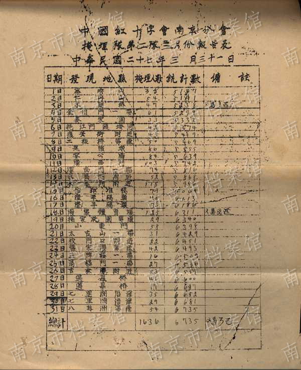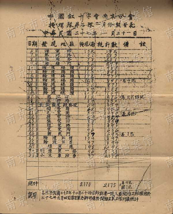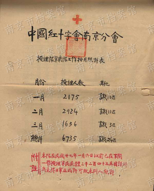 中国红十字会南京分会于南京沦陷后从事施粥、掩埋、施材、施医送药等慈善救济工作。南京市档案馆保存有该会掩埋队的工作统计档案。