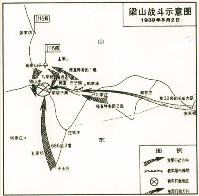 1939年8月2日,第一一五师特务营、骑兵连、独立旅第一团第三营等部,在罗荣桓、陈光指挥下,于梁山西南独立庄一带,将经汶上县城出犯之日军第三十二师团步兵、炮兵各一部和伪军共400余人全歼,毙敌少佐大队长长田敏江以下300余人,俘日军13人,缴获炮3门、轻重机枪20余挺、长短枪150余支、战马50匹。创造了八路军部队在敌我兵力相当,而装备处于劣势的条件下,全歼日军1个大队的模范战例。