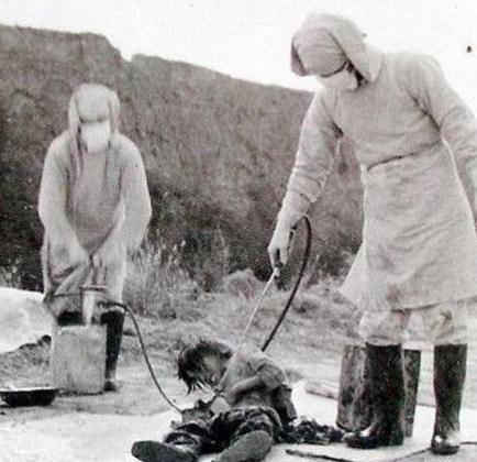 据731原队员镰田回忆,他在降旗班做鼠疫、疫苗的研究助手,他所在的研究班多次进行细菌传染的“雨下实验”,所谓“雨下实验”就是把霍乱菌液或伤寒菌液或菌液装进喷散器里,到空中往下喷洒。经过验证,用这种方式喷洒霍乱、伤寒菌效果好,但不适用于鼠疫菌。实地投撒细菌的事,731部队在诺门罕战争中使用过。