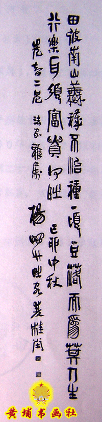 先父在金石书画上颇有造诣,豪称“三万石印室”,在金石篆刻上,风格豪放,刀法精致、独特,打印精细,很具艺术水平,其作品有很高的艺术价值 (北京图书馆金石组语)。先父印章,皆用刺绣锦缎成盒装藏,盒面均绣有名人书画。并由章炳麟(太炎)先生选编《杨鹏升印谱》数集。1950年,先父曾赠毛泽东主席一套《杨鹏升印谱》,后又将20余种金石书画作品捐赠北京图书馆。在书画上,先父尤善书法与国画,形成了自己的个人独特的艺术风格。由于长年的挚著追求,契而不舍,使之在艺术上近乎炉火纯青,郭沫若曾赋诗日:“与人论艺常称公,蜀派印圣一世雄;味道神韵逼两汉,劲草先生知疾风。”其作品北京图书馆和四川博物馆均有收藏,流失民间藏家手中想也不少。我辈几经风霜磨难,先父作品几无保存,惜哉!痛哉!