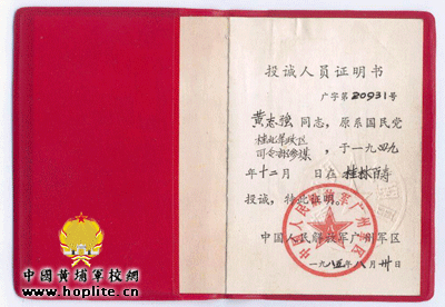 1945年,日本帝国主义无条件投降,驻印军总指挥部亦宣告解散,部队人员有的分下部队,或有的到前线受降,我被分陆军总部。并且坐最后一架飞机装运全部指挥部各处室的历年档案文件到昆明,陆军总部已全部飞南京受降,昆明已无人员留守。欲要即进追逐前往又无交通工具,只得留落昆明,后来到昆明机场守备部参谋处工作。全国缩编时,守备部亦被编,官员全部编到昆明十六军官总队为队员,那时有考留用军官,所以我参加考留用军官,后送南京中训团为服勤校官。大军渡江南下时,中训团移到广州,随团到广州,不久中训团又要飞台。那时我离团准备还乡,但当时身上只有十块钱,如何能回到家乡。抵达桂林时,桂林军政区成立之初,不到一个月,我们已起议投诚了,收编为解放军第49军,当时百寿里面还有一个排还没出来投诚,参谋处长蒋道宽便令我单身一人进里面去说服他们出来,交给第49军。军官就集中受训,受训三个多月后,最后按个人志愿处理,愿工作者给予工作,愿随大军的送去随军,愿退伍还乡的给证件退伍还乡等妥善处理。当时我感到投军抗日到胜利还从没回家探亲过,就想趁此离家乡近,回家探望,所以选择退伍。