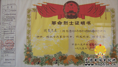 中华人民共和国颁发给周复将军家属的烈士证