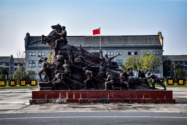 随后,我们来到何家冲学院。一进大门,一座巨大的“北上先锋”红军雕塑映入眼帘:红军将士们高举旗帜、昂首前行,眼神坚定而执着,仿佛正奔赴抗日救国的战场。跨过寓意“传承红色基因”的红军桥,我们来到学院内的“北上先锋——红二十五军长征出发地专题陈列展”。11月16日恰逢星期天,学院原本处于休息状态,讲解员吴梦兰是个热心的女孩子,她放弃了休息时间,专门赶来为我们讲解,身上穿的也是日常便装。