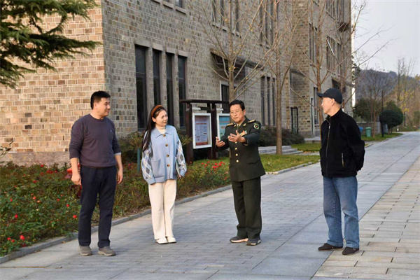 参观完陈列展,我们沿着学院的步道边走边交流,不知不觉来到了初心堂前。这座庄严肃穆的建筑,是党员干部重温入党誓词、感悟初心使命的重要场所。堂前的广场上,一面鲜红的党旗迎风飘扬,与远处的大别山相映成景。“来,我们在这里合张影,留住这段难忘的红色之旅!”蔡大哥提议道。我们四人并肩站在初心堂前,面向镜头,挺直腰板,仿佛又回到了激情燃烧的岁月。快门按下的瞬间,不仅定格了我们的笑容,更定格了我们对革命先烈的缅怀、对长征精神的传承。