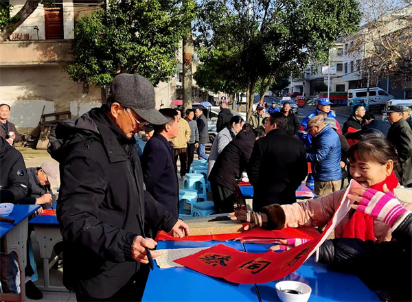 上午的十里坪村暖意融融,“挥墨为社区村组送联”活动率先启幕。数位书法爱好者现场铺展红纸、挥毫泼墨,笔走龙蛇间,一幅幅寓意吉祥的春联跃然纸上。“毛公伟业千秋颂,盛世华章万代传”“乡村振兴添锦绣,民生幸福沐春晖”,红色的春联承载着对伟人的敬仰、对新春的期盼和对美好生活的向往,被村民们争相领取,贴进农家小院,将红色祝福与年俗温情送到千家万户。拿到春联的村民王大爷激动地说:“这样的春联既有文化味,又有红色情,贴在门上,心里亮堂!”