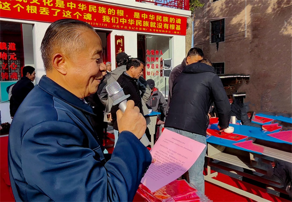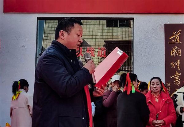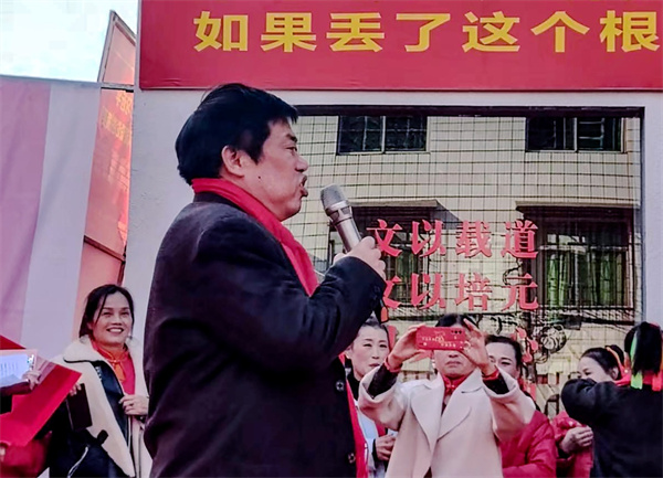 午后时分,文艺汇演序幕缓缓拉开。活动现场,《红旗颂》的轻柔旋律渐起,近千面红旗迎风舞动,营造出庄严肃穆又热烈昂扬的氛围。红日国学院院长李剑光首先致开幕辞,他深情回望中华优秀传统文化的深厚底蕴,指出新春汇演与送春联不仅是年俗的延续,更是文化根脉的唤醒与传承。“要让高雅文化真正走进村组社区,融入百姓日常,化为滋养心灵的精神养分。”李剑光的话语引发全场共鸣。
