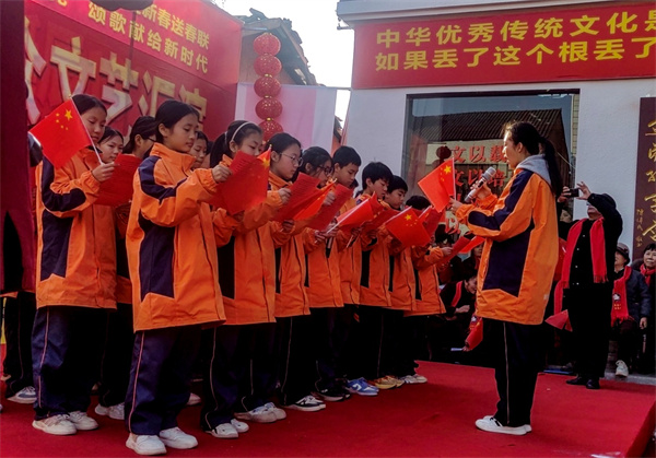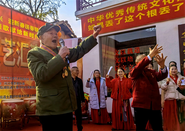 整场汇演中,红日国学院国之栋梁班小朋友李屹宸带来的诗朗诵《人民解放军占领南京》堪称点睛之笔。“宜将剩勇追穷寇,不可沽名学霸王”,稚嫩却铿锵的语调穿越时空,既展现了毛泽东同志诗词的磅礴气势,更彰显了红色基因代代相传的强大生命力,赢得全场经久不息的掌声。互动环节“猜谜语,送春联”更是将气氛推向高潮,村民们踊跃参与,在欢声笑语中收获满满的新春祝福。最后,京剧协会带来的红歌联唱,让激昂的旋律再次回荡在乡村上空,重温红色记忆,凝聚奋进力量。