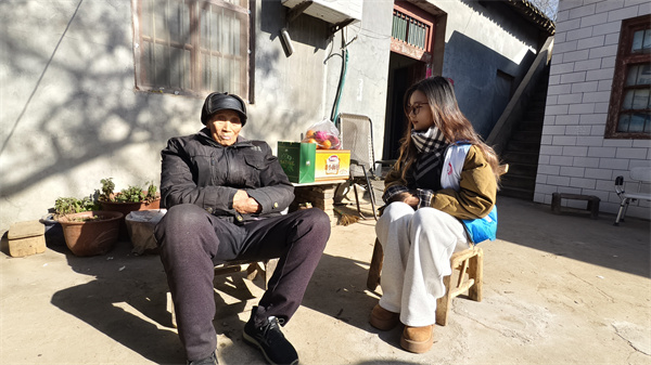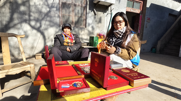 2026年1月12日,郑州西亚斯学院大二学生吴怡璇与郏县关爱抗战老兵志愿者团队一行5人,怀着对革命先辈的崇敬之心,来到白庙乡下叶村,专程拜访102岁的抗战老兵叶青志,在挂满“民族脊梁”牌匾和荣誉纪念章的农家小院里,老人沙哑却坚定的歌声,将青年学子带回了那个烽火连天的抗战年代。