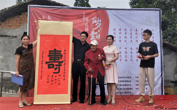 抗战老兵易克林先生百岁寿诞时,作者为其献上了书法作品“寿”,祝福抗战老兵福如东海长流水,寿比南山不老松。