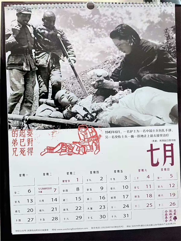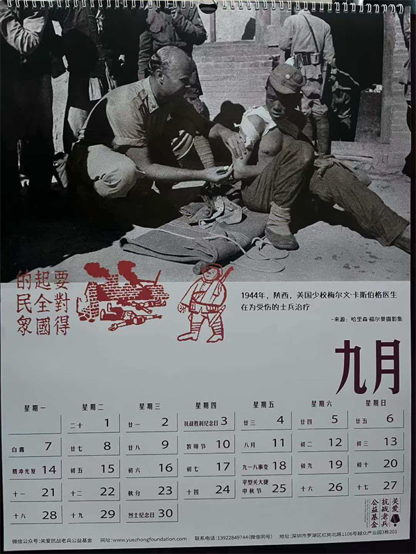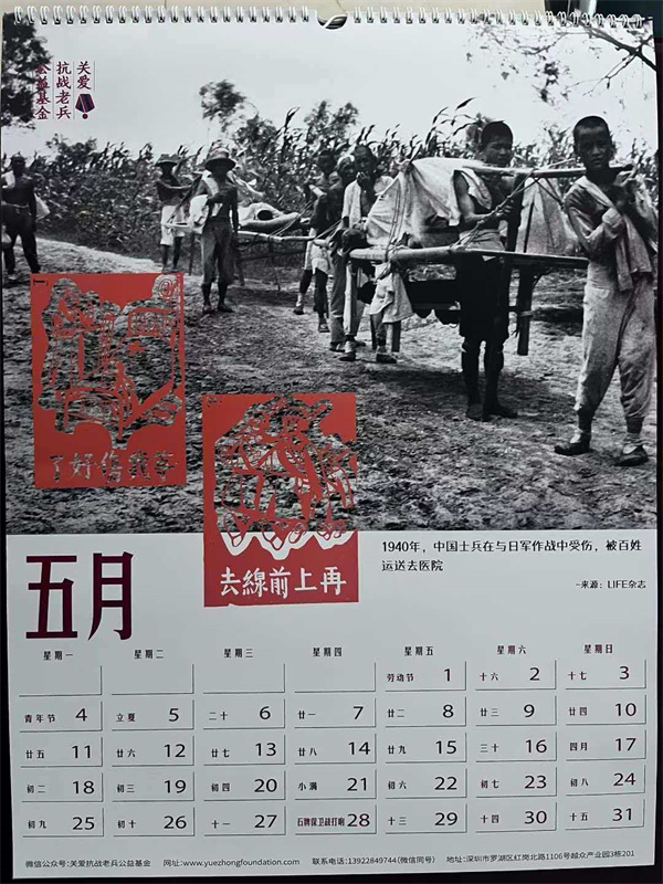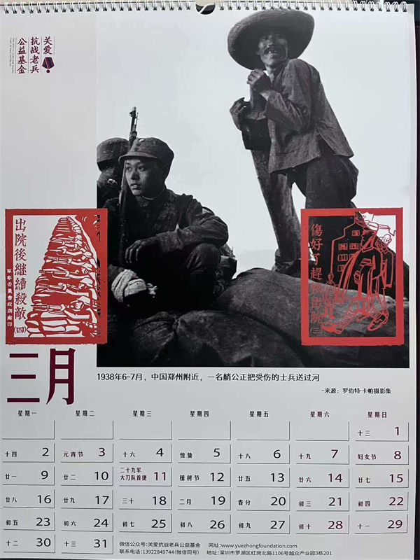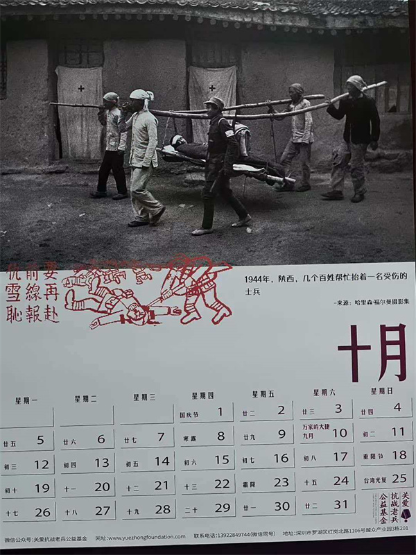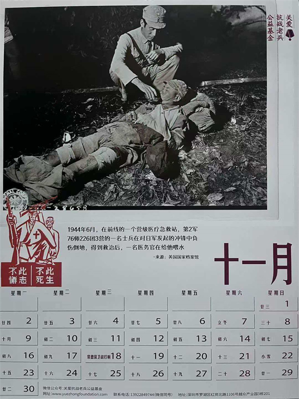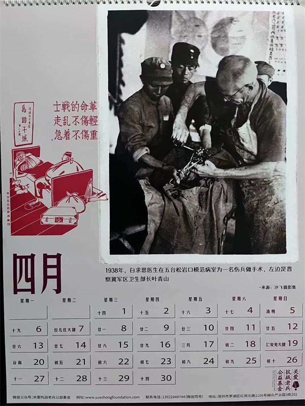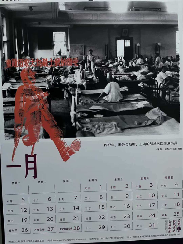 收到关爱抗战老兵公益基金设计制作的新年挂历,每年的我都保存着,已经有厚厚一叠。今年的主题是“抗战中的伤兵”。采用了13张伤兵的照片,有淞沪会战、台儿庄会战、滇缅远征军伤员的照片,还有白求恩大夫和美国军医抢救伤员的镜头。