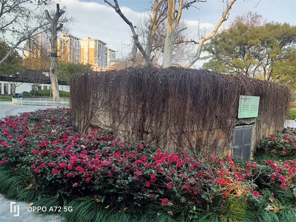 走进共和新路1555号公园的西大门后,向北约百米,在宋教仁墓园东侧的广场旁就见到了“方形地堡”。地堡略呈方形,实际上是个六边形,其中东北和西北方向的两个立面很窄,只有1米多宽。钢筋水泥结构,离地面高约2米,不足5米见方,壁厚近1米,十分坚固,下半部分掩埋在泥土中。三个大的立面上均有机枪射击口(观察口),外宽内窄,逐阶收缩,西南方向的大立面上,有个1米见方的地堡出入口。地堡周围是一圈山茶花和麦冬围着,虽是冬天色彩仍然鲜艳。地堡外面满是爬山虎,90余载的风雨沧桑,在那些老藤盘根错节处隐约可见。