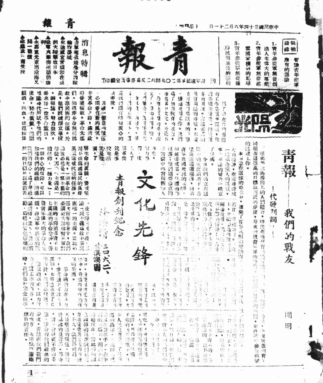 1945年6月21日《青报》创刊号第一版,《青报——我们的战友 代发刊词》