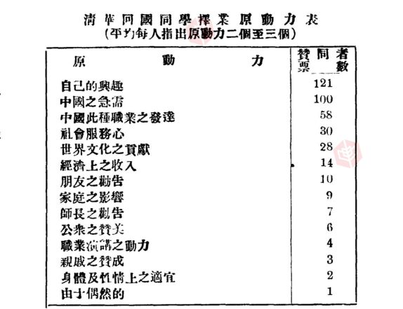 1924年6月,《清华周刊》登载的一批择业数据就显示,“中国之急需”是清华回国同学择业的一种主要原动力。表格出自平台收录的《清华周刊》第10次增刊。