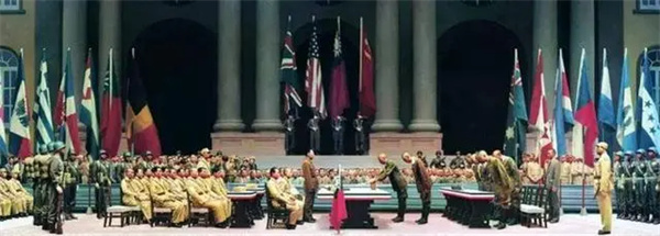 画面庄严肃穆,正中央从左到右是按英、美、中、苏(事实上是按美、中、英、苏)的先后顺序从中间向两边展开的。画面中包含了近似于真人大小的200多个人物,场面宏大,画家通过正面的纪实手法真实再现了抗日战争胜利后,日本军国主义向我国军民投降的场面。