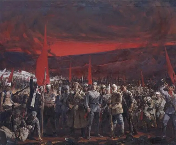 画面构图丰富饱满,充分利用了地形的起伏变化,使人物群体形成高低错落的关系;色彩单纯、朴素、凝重,冷灰的天空、黄土坡和人物的黑、灰棉袄、棉裤的重色块团,形成了画面的基本色调,红色的队旗强调了作品的主题,也提亮了画面的整体气氛。