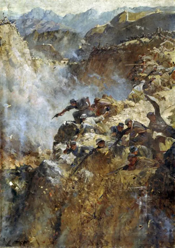这幅由任梦璋、杨为铭创作的油画《平型关大捷》采用竖幅、俯瞰的角度构图,突出了地势的险要和八路军勇猛顽强的战斗精神。