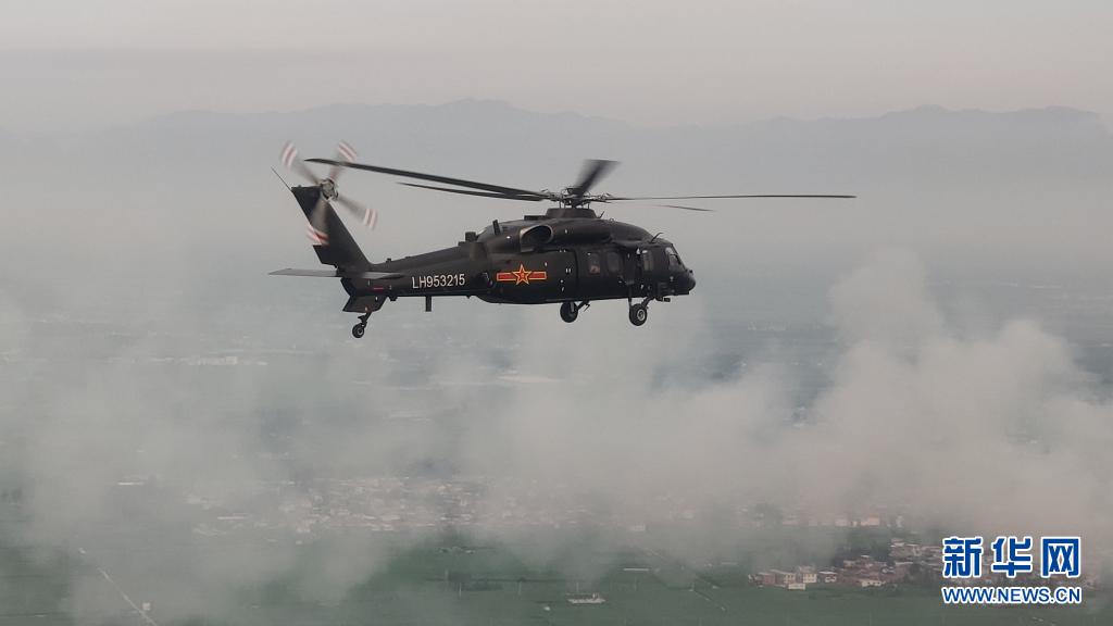 7月24日,陆军第83集团军某旅出动直-20直升机向河南省新乡市辉县洪州乡、峪河镇等地投送物资