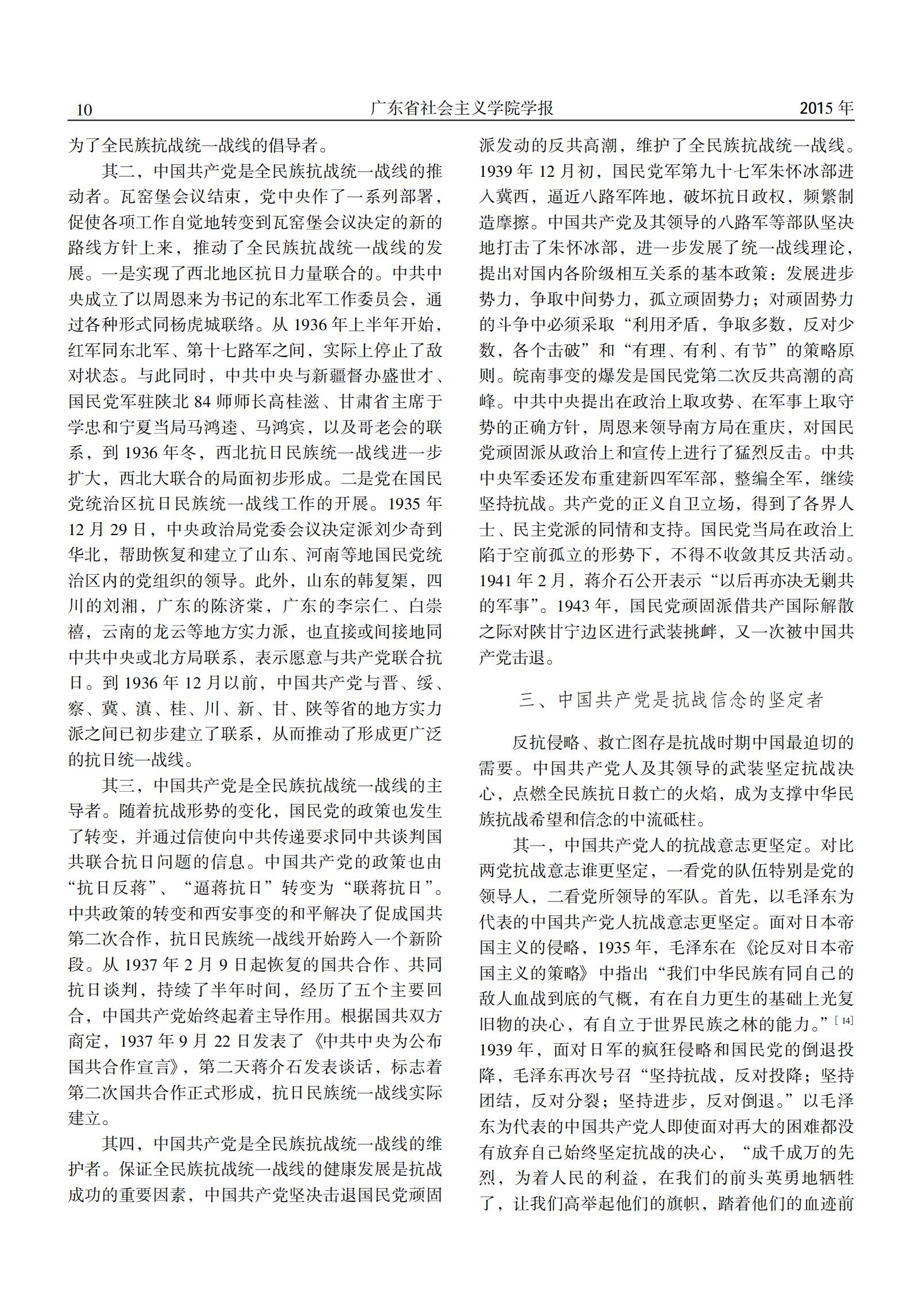 中国共产党提出的以“国共合作”为核心的抗日民族统一战线,是中华民族战胜日本侵略者的法宝。中国共产党在全民族抗战统一战线中作为倡导者、推动者、主导者和维护者,成为了统一战线的组织者,发挥了中流砥柱的作用,赢得了全国上下一致的信任。