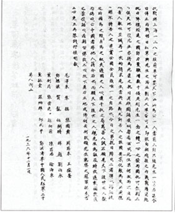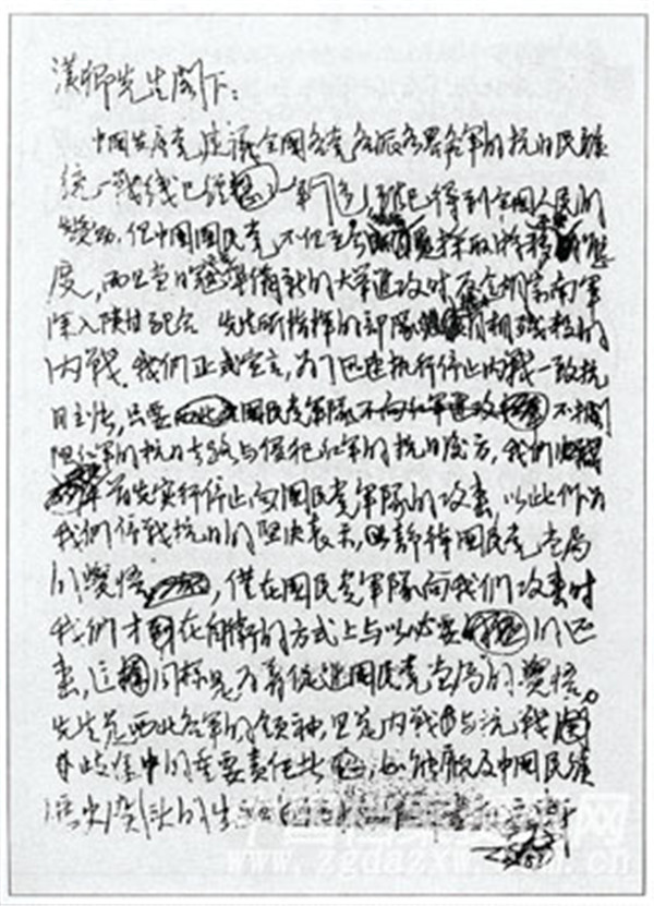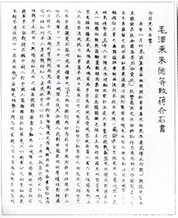 1936年12月1日,《毛泽东朱德等致蒋介石书》呼吁“停止内战、一致抗日”。