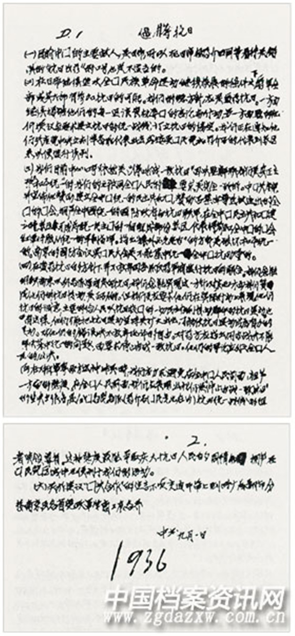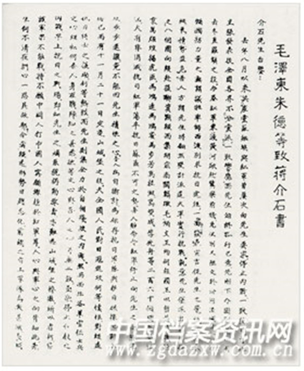 1936年12月1日,《毛泽东、朱德等致蒋介石书》。(节录)