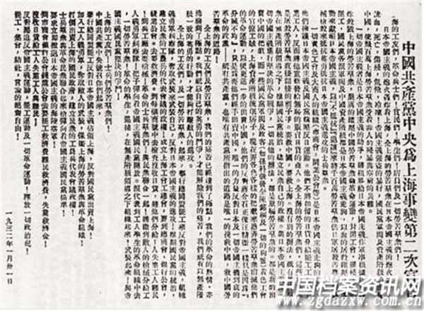 1932年1月31日,《中国共产党中央为上海事变第二次宣言》。