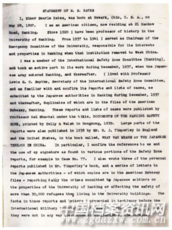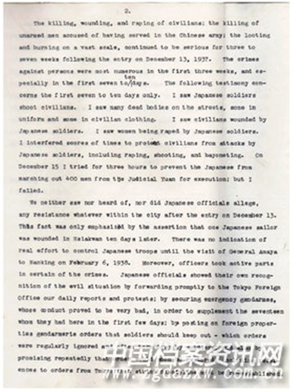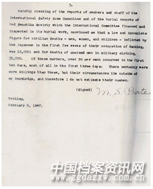 此组档案为1947年2月6日,美国贝德士博士证词。时任金陵大学历史学系教授的贝德士,在南京大屠杀期间作为南京国际安全区委员会委员参与实际工作。在证词中,他历数日军所犯各种屠杀、奸淫及抢劫的暴行,并强调这些暴行确为实情。