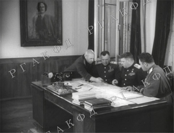 苏联远东军总司令华西列夫斯基元帅(左三)、总司令部参谋长伊万诺夫大将(右一)在远东工农红军武装力量最高统帅大本营(俄罗斯国家影片照片档案馆提供)