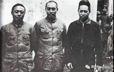 新四军长叶挺(右一),政委项英(左一)和周恩来合影