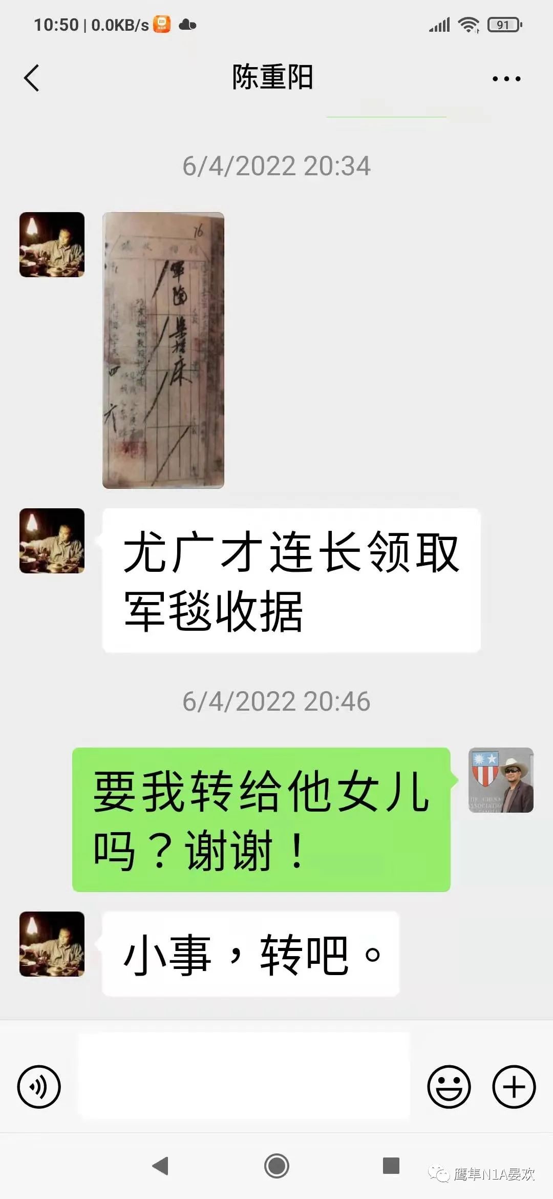 2022年4月6日晚,远征军文史专家晏欢通过微信发给我一张图片,是知名民国军史研究学者陈重阳在云南祥云县档案馆发现了父亲尤广才的历史资料:那是在民国三十三年四月六日,父亲任陆军第五十四军五十师特务连连长为连队领取军毯70床的签字记录。